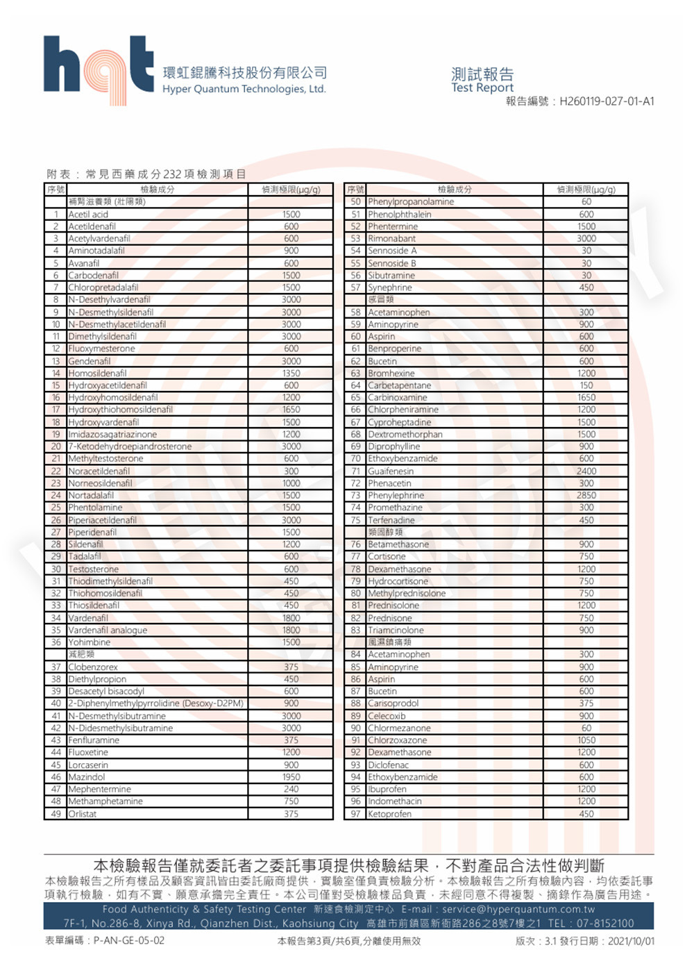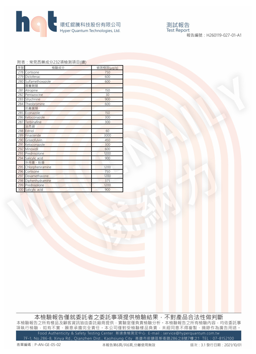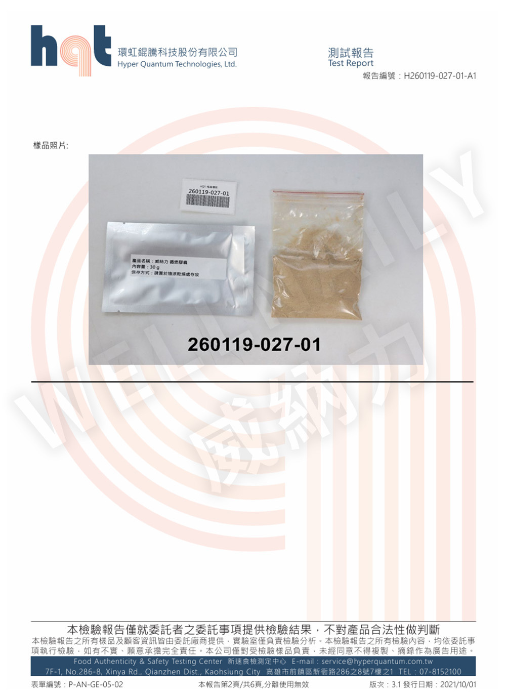 💡 檢驗報告僅對送測樣品負責,不代表功效宣稱。實際資訊請以包裝標示為準。