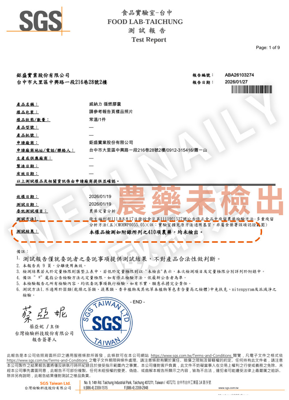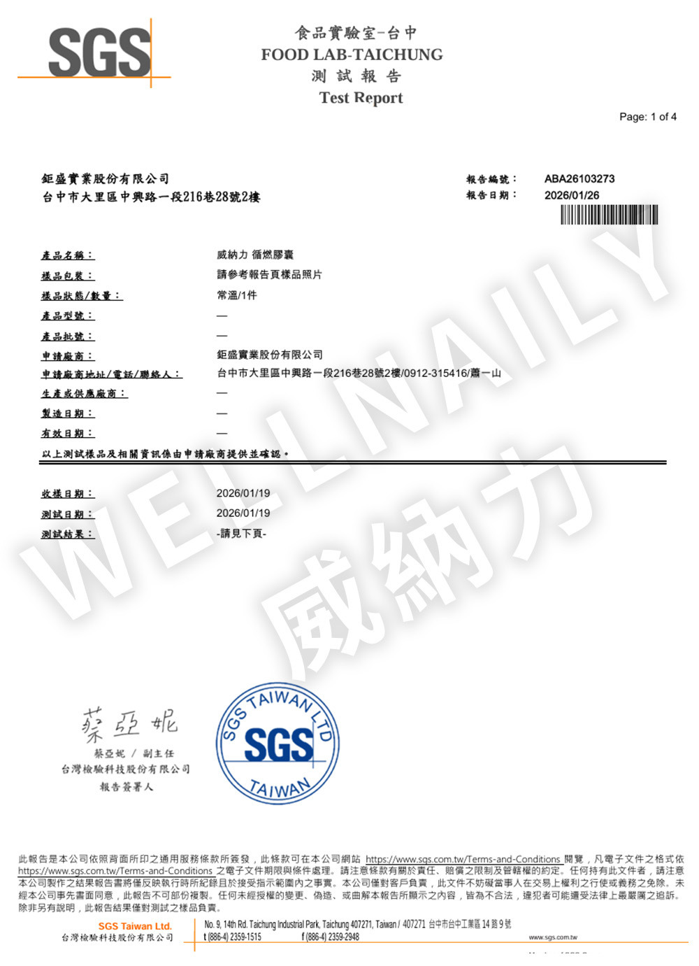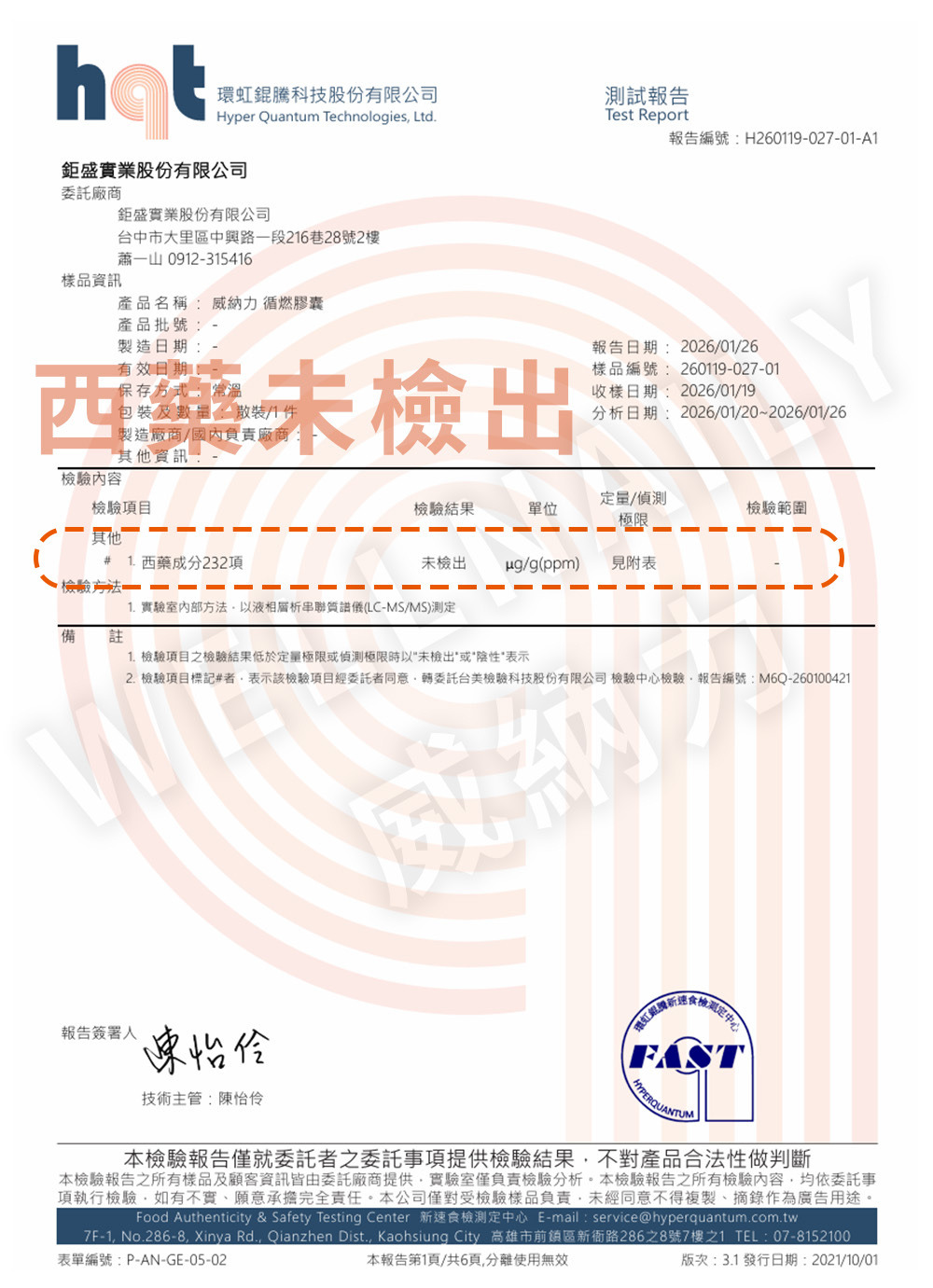 本頁公開威納力 循燃膠囊之完整檢測數據,提供透明資訊供查閱。